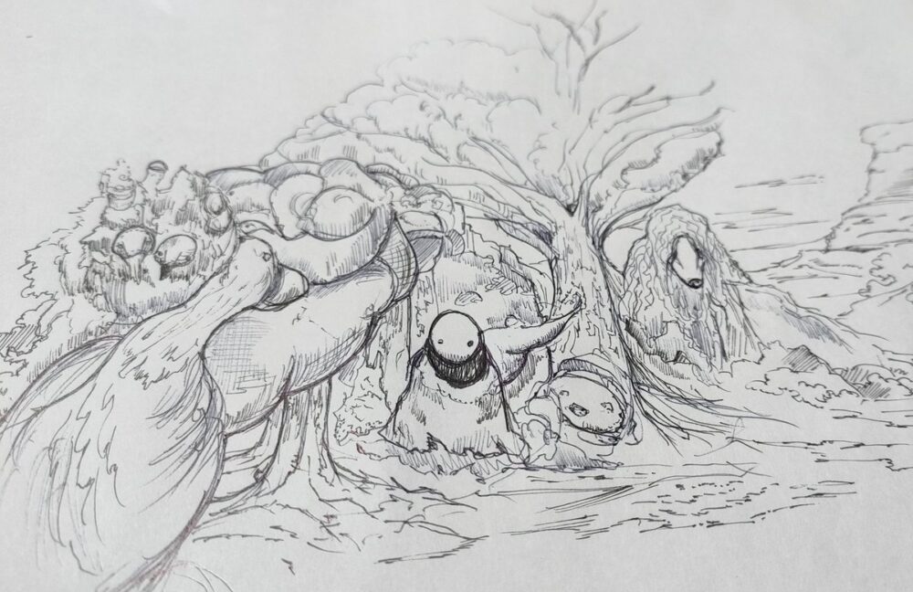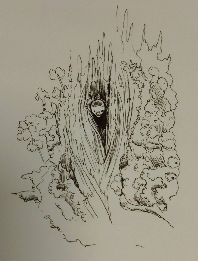 専らペン画ではこういう感じの絵になっている。一見意味不明でしょ、僕も意味が分からないんですが。 とにかくペンを躍らせています。 🖋この絵の物語(約1000文字) その森には、長い時間を生きた古木が一本 ...
