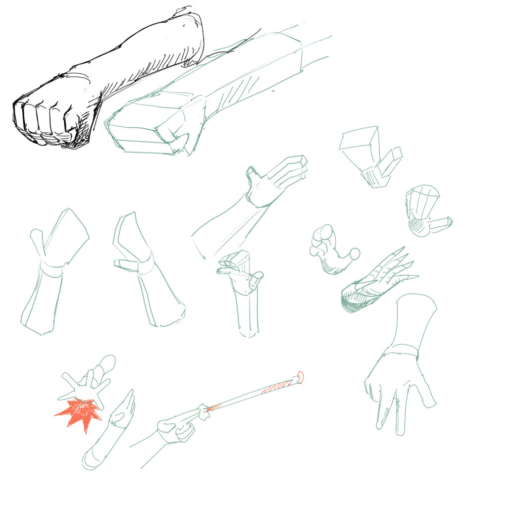 まず最初に意識したのは「手を記号化すること」。骨や筋肉の複雑さに引っ張られる前に、手全体をざっくりとした立体として見ていく。手の甲は箱、指は円柱、手首から肘にかけてはテーパーのついた柱。この段階では細かい形にはこだわらず、向きとボリュームを確認するだけで十分。今回のラフでも、薄い線で立方体を描いて角度を探っているものが多いのは、そのためだ。